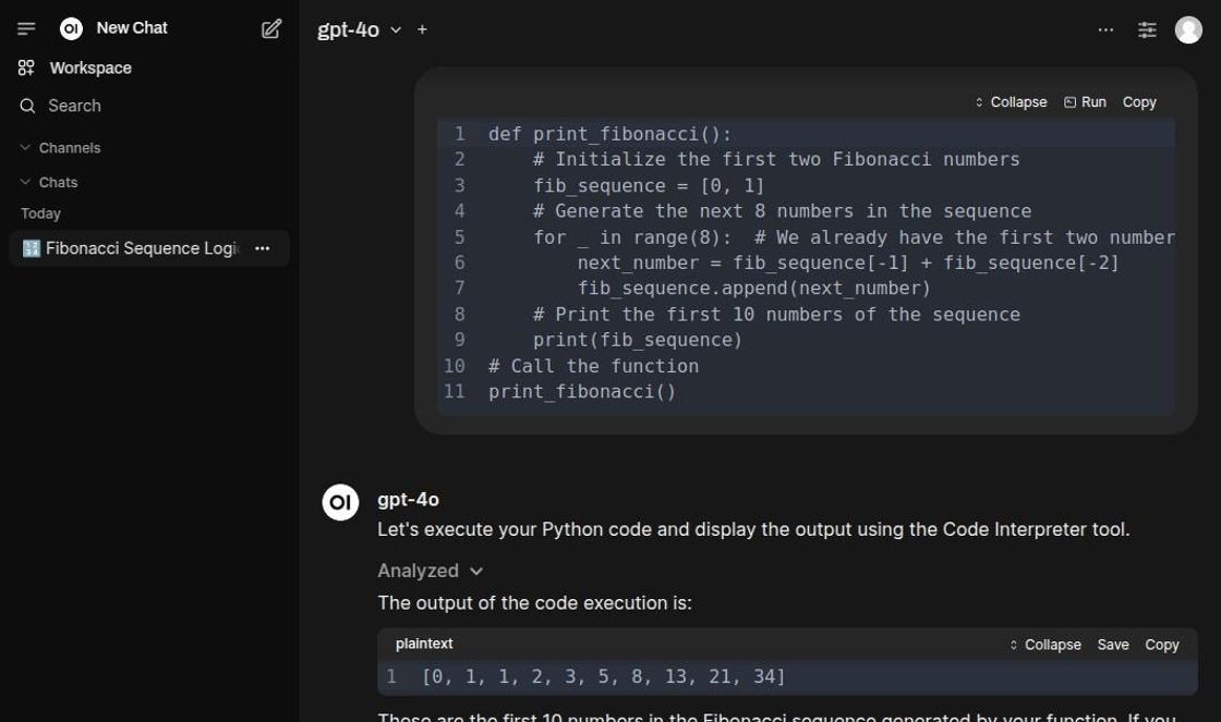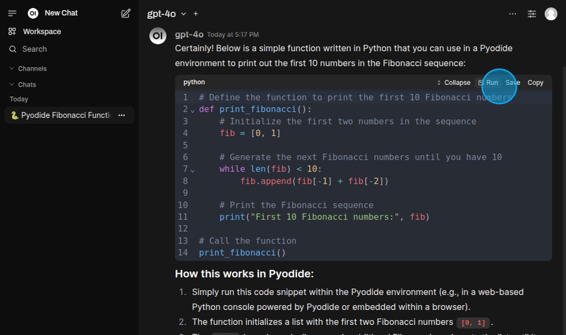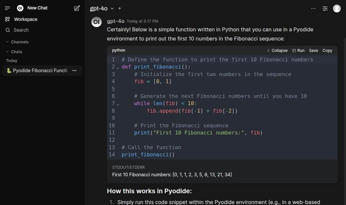 - Either the model writes the code, which can be hinted by metioning the "Pydiode environment" which is used to execute the code. This gives the model the indication the user wants to work with code and will try to answer the request by writing code.